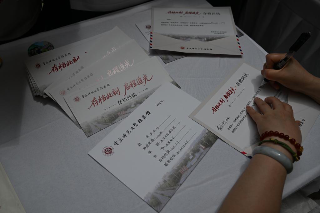 活动特别设置“存档此刻,启程追光”毕业生留档环节。2025届毕业生写下对母校的深切感情、毕业感想、理想目标或对自己的寄语,签名后装入信封,交由档案馆编号缄封典藏。待毕业十年后同学们重回母校聚会时,到档案馆领取、启封、阅读和珍藏。